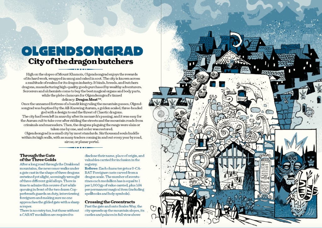 As if that wasn’t enough, Drought Dragon Desolation is being kickstarted in tandem with another original adventure by Eric Neudan (illustrated by Artyrom Trakhanov with cartography by Jerome Huguenin). They’re Making Hostage Sausage at the Dragonmeat Processing Plant! is an urban heist adventure set in the wealthy dragon-butchering city of Olgendsongrad complete with everything an OSR referee needs to run a dynamic and exciting infiltration adventure.